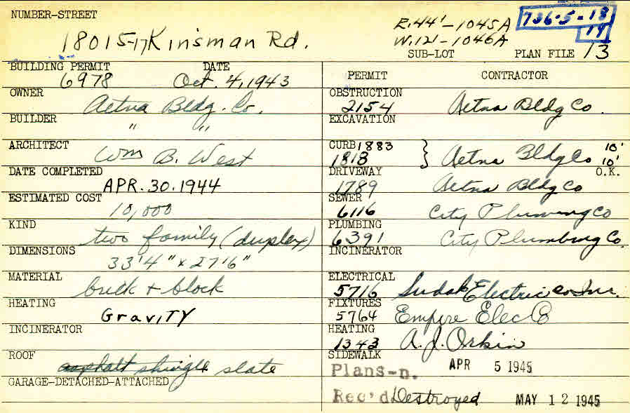 18015 Chagrin Boulevard Shaker Heights, OH 44122 PARCEL ID: 736-05-018 Building Permit Date: 10-04-1943 Plan File Number: 13, 6044, 9775 Microfilm Roll: Roll#80, Roll#104 Neighborhood: Lomond Owner: Aetna Building Company Builder: Aetna Building Company Architect: West, William B. Estimated Cost: 10000 Date Completed: 04-30-1944 Kind: Duplex or Two-Family Material: Brick and Block Heating: Gravity System Roof: Slate |
