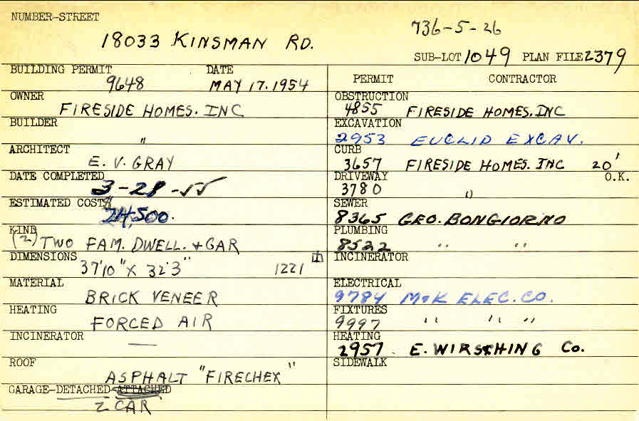 18033 Chagrin Boulevard Shaker Heights, OH 44122 PARCEL ID: 736-05-026 Building Permit Date: 05-17-1954 Plan File Number: 2379 Microfilm Roll: Roll#34 Neighborhood: Lomond Owner: Fireside Homes, Inc. Builder: Fireside Homes, Inc. Architect: Gray, E. V. Estimated Cost: 24500 Date Completed: 03-28-1955 Kind: Duplex or Two-Family and Garage Material: Brick Veneer Heating: Forced Air Roof: Asphalt Garage: detached 2 car |