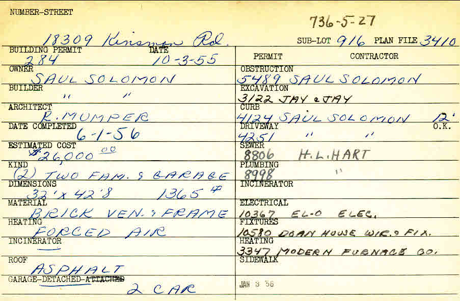 18309 Chagrin Boulevard Shaker Heights, OH 44122 PARCEL ID: 736-05-027 Building Permit Date: 10-03-1955 Plan File Number: 3410, 5485 Microfilm Roll: Roll#50, Roll#74 Neighborhood: Lomond Owner: Solomon, Saul Builder: Solomon, Saul Architect: Mumper, R. Estimated Cost: 26000 Date Completed: 06-01-1956 Kind: Duplex or Two-Family and Garage Material: Brick Veneer and Frame Heating: Forced Air Roof: Asphalt Garage: detached 2 car |