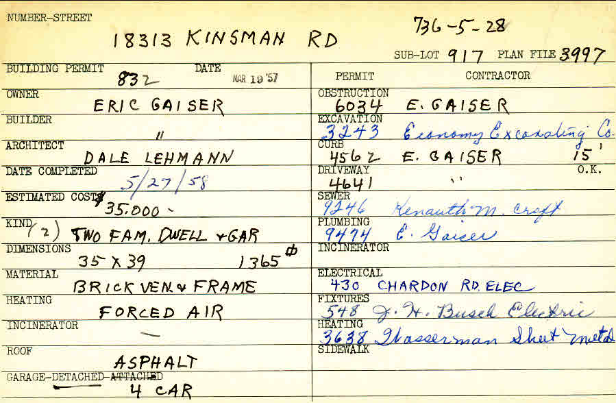 18313 Chagrin Boulevard Shaker Heights, OH 44122 PARCEL ID: 736-05-028 Building Permit Date: 03-19-1957 Plan File Number: 3997 Microfilm Roll: Roll#58 Neighborhood: Lomond Owner: Gaiser, Eric Builder: Gaiser, Eric Architect: Lehmann, Dale Estimated Cost: 35000 Date Completed: 05-27-1958 Kind: Duplex or Two-Family and Garage Material: Brick Veneer and Frame Heating: Forced Air Roof: Asphalt Garage: detached |