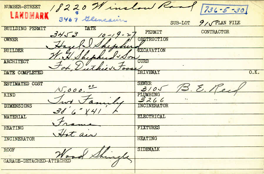18220 Winslow Road Shaker Heights, OH 44122 PARCEL ID: 736-05-030 Building Permit Date: 10-19-1927 Plan File Number: 6467 Microfilm Roll: Roll#86 Neighborhood: Lomond Owner: Shepherd, Hazel I. Builder: W. H. Shepherd and Son Architect: Fox, Duthie and Foose Estimated Cost: 15000 Kind: Duplex or Two-Family Material: Frame Heating: Hot Air Roof: Wood Shingle |