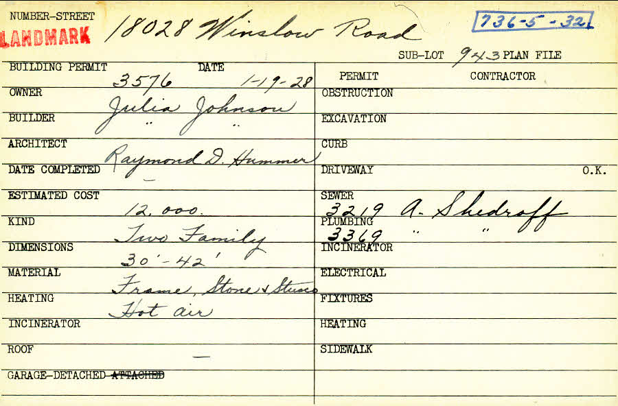 18028 Winslow Road Shaker Heights, OH 44122 PARCEL ID: 736-05-032 Building Permit Date: 01-19-1928 Plan File Number: 0 Neighborhood: Lomond Owner: Johnson, Julia Builder: Johnson, Julia Architect: Hummer, Raymond D. Estimated Cost: 12000 Kind: Duplex or Two-Family Material: Frame, Stone and Stucco Heating: Hot Air Garage: detached |