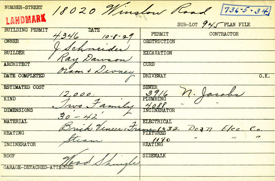 18020 Winslow Road Shaker Heights, OH 44122 PARCEL ID: 736-05-034 Building Permit Date: 10-08-1929 Plan File Number: 0 Neighborhood: Lomond Owner: Schneider, J. Builder: Dawson, Ray Architect: Oram and Devney Estimated Cost: 12000 Kind: Duplex or Two-Family Material: Brick Veneer and Frame Heating: Steam Roof: Wood Shingle |