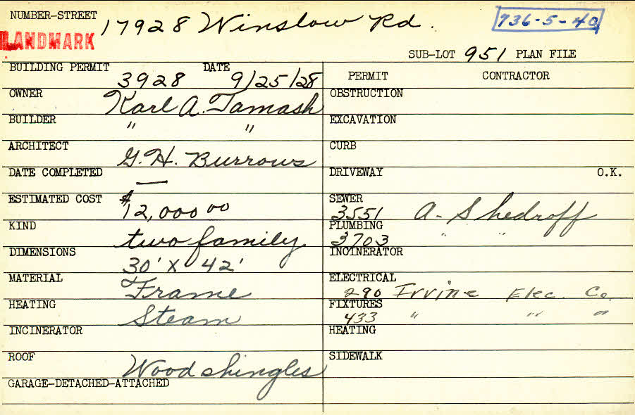 17928 Winslow Road Shaker Heights, OH 44122 PARCEL ID: 736-05-040 Building Permit Date: 09-25-1928 Plan File Number: 0 Neighborhood: Lomond Owner: Tomash, Karl A. Builder: Tomash, Karl A. Architect: Burrows, G. H. Estimated Cost: 12000 Kind: Duplex or Two-Family Material: Frame Heating: Steam Roof: Wood Shingle |