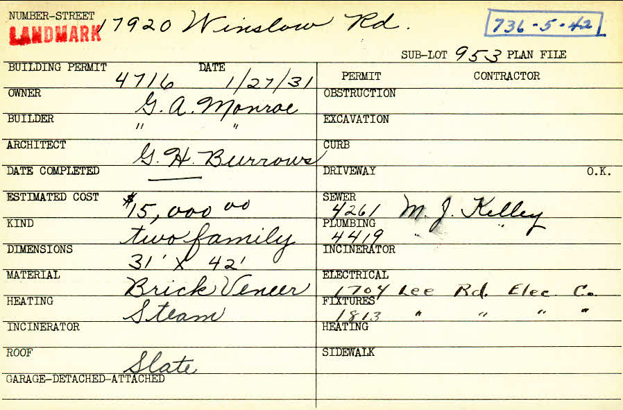 17920 Winslow Road Shaker Heights, OH 44122 PARCEL ID: 736-05-042 Building Permit Date: 01-27-1931 Plan File Number: 5932 Microfilm Roll: Roll#80 Neighborhood: Lomond Owner: Monroe, G. A. Builder: Monroe, G. A. Architect: Burrows, G. H. Estimated Cost: 15000 Kind: Duplex or Two-Family Material: Brick Veneer Heating: Steam Roof: Slate |