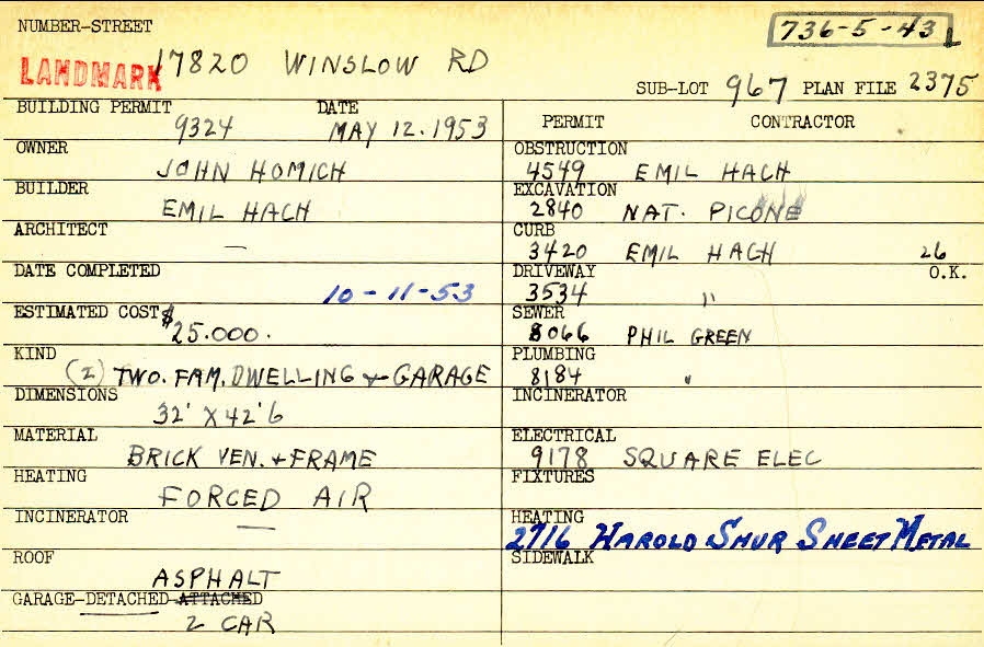17820 Winslow Road Shaker Heights, OH 44122 PARCEL ID: 736-05-043 Building Permit Date: 05-12-1953 Plan File Number: 2375 Microfilm Roll: Roll#34 Neighborhood: Lomond Owner: Homich, John Builder: Hach, Emil Estimated Cost: 25000 Date Completed: 10-11-1953 Kind: Duplex or Two-Family and Garage Material: Brick Veneer and Frame Heating: Forced Air Roof: Asphalt Garage: detached 2 car |