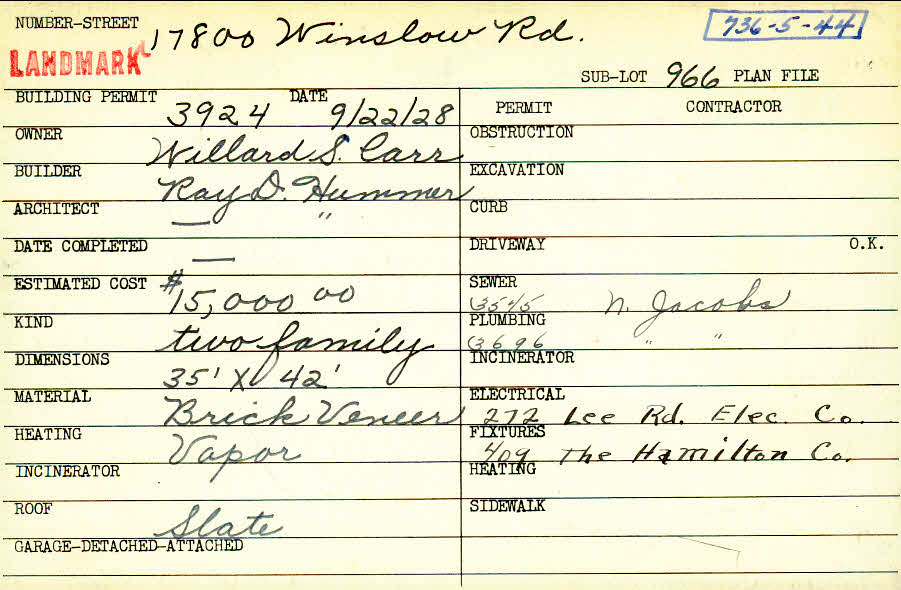 17800 Winslow Road Shaker Heights, OH 44122 PARCEL ID: 736-05-044 Building Permit Date: 09-22-1928 Plan File Number: 4309 all scanned Microfilm Roll: Roll062 Neighborhood: Lomond Owner: Carr, Willard S. Builder: Hummer, Ray D. Architect: Hummer, Ray D. Estimated Cost: 15000 Kind: Duplex or Two-Family Material: Brick Veneer Heating: Vapor Roof: Slate |
