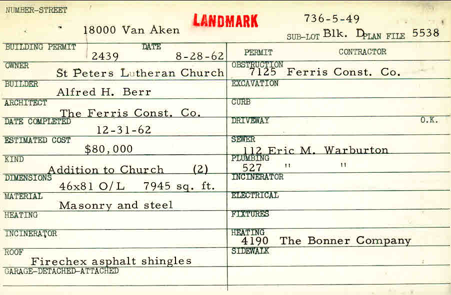 18000 Van Aken Boulevard Shaker Heights, OH 44120 PARCEL ID: 736-05-049 Building Permit Date: 08-27-1962 Plan File Number: 5538, 4879 Microfilm Roll: Roll#67, Roll#75 Neighborhood: Lomond Owner: Saint Peter's Lutheran Church Builder: Berr, Alfred H. Architect: The Ferris Construction Company Estimated Cost: 80000 Date Completed: 12-30-1962 Kind: Government and Municipal (incl. Schools) Material: Masonry and Steel Roof: Asphalt Shingles |