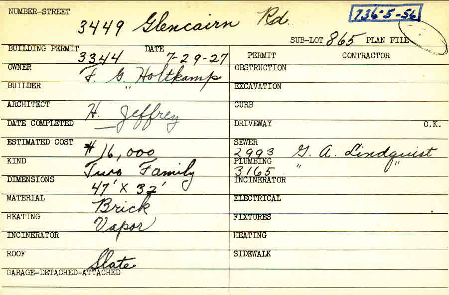 3449 Glencairn Road Shaker Heights, OH 44122 PARCEL ID: 736-05-056 Building Permit Date: 07-29-1927 Plan File Number: 10618 Microfilm Roll: NewRoll#5 Neighborhood: Lomond Owner: Holtkamp, F. G. Builder: Holtkamp, F. G. Architect: Jeffrey, H. Estimated Cost: 16000 Kind: Duplex or Two-Family Material: Brick Heating: Vapor Roof: Slate |