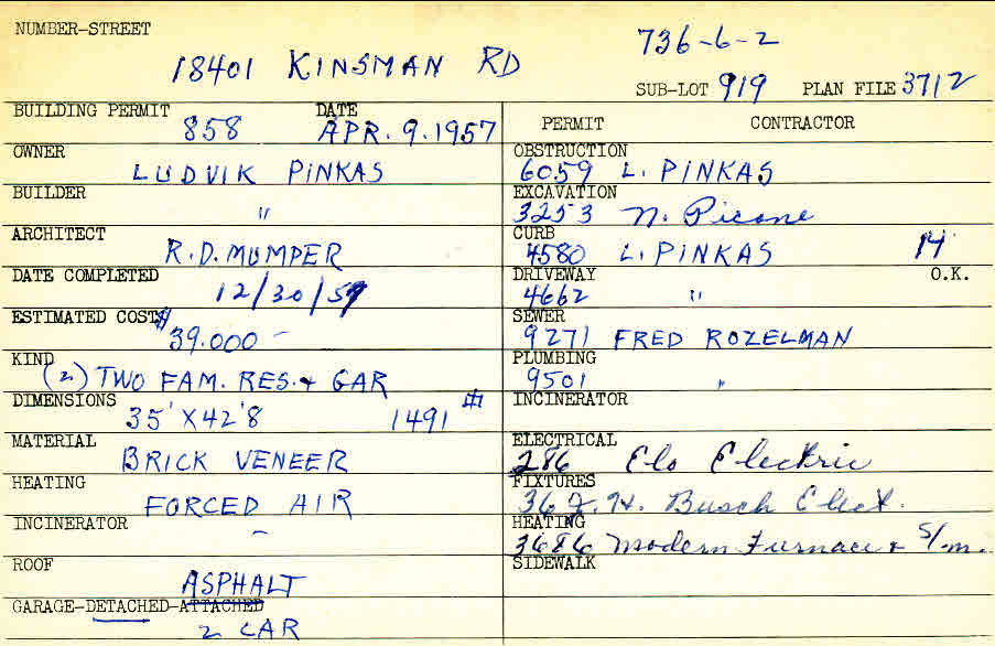 18401 Chagrin Boulevard Shaker Heights, OH 44122 PARCEL ID: 736-06-002 Building Permit Date: 04-09-1957 Plan File Number: 3712 Microfilm Roll: Roll#51 Neighborhood: Lomond Owner: Pinkas, Ludvik Builder: Pinkas, Ludvik Architect: Mumper, R. D. Estimated Cost: 39000 Date Completed: 12-30-1957 Kind: Duplex or Two-Family and Garage Material: Brick Veneer Heating: Forced Air Roof: Asphalt Garage: detached 2 car |