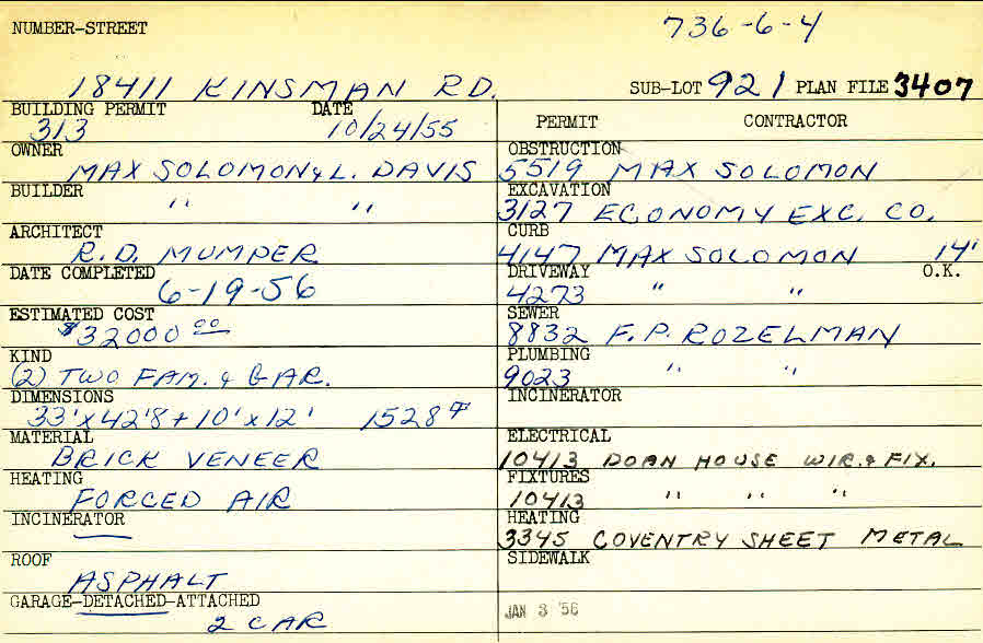 18411 Chagrin Boulevard Shaker Heights, OH 44122 PARCEL ID: 736-06-004 Building Permit Date: 10-24-1955 Plan File Number: 3407 Microfilm Roll: Roll#50 Neighborhood: Lomond Owner: Solomon, Max and Davis, L. Builder: Solomon, Max and Davis, L. Architect: Mumper, R. D. Estimated Cost: 32000 Date Completed: 06-19-1956 Kind: Duplex or Two-Family and Garage Material: Brick Veneer Heating: Forced Air Roof: Asphalt Garage: detached 2 car |