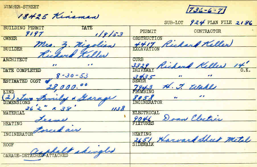 18425 Chagrin Boulevard Shaker Heights, OH 44122 PARCEL ID: 736-06-007 Building Permit Date: 01-09-1953 Plan File Number: 2186 Microfilm Roll: Roll#33 Neighborhood: Lomond Owner: Nigolian, Mrs. Z. Builder: Keller, Richard A. Architect: Keller, Richard A. Estimated Cost: 28000 Date Completed: 08-30-1953 Kind: Duplex or Two-Family and Garage Material: Frame Heating: Forced Air Roof: Asphalt Shingles Garage: detached |