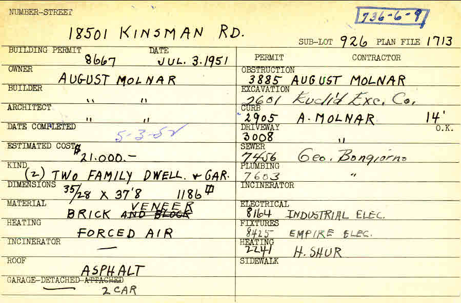 18501 Chagrin Boulevard Shaker Heights, OH 44122 PARCEL ID: 736-06-009 Building Permit Date: 07-03-1951 Plan File Number: 1713 all scanned Microfilm Roll: Roll026 Neighborhood: Lomond Owner: Molnar, August Builder: Molnar, August Architect: Molnar, August Estimated Cost: 21000 Date Completed: 05-03-1952 Kind: Duplex or Two-Family and Garage Material: Brick Veneer Heating: Forced Air Roof: Asphalt Garage: detached 2 car |