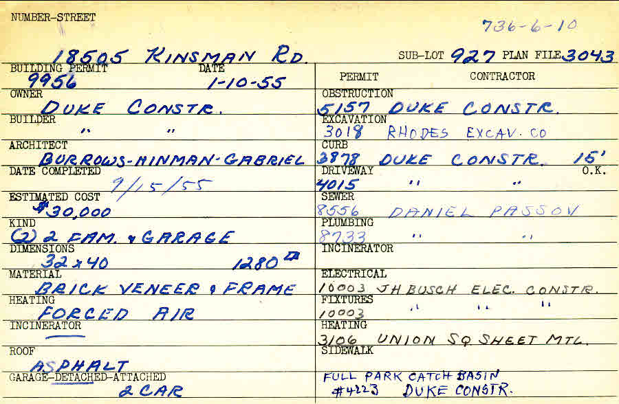 18505 Chagrin Boulevard Shaker Heights, OH 44120 PARCEL ID: 736-06-010 Building Permit Date: 01-10-1955 Plan File Number: 3043 Microfilm Roll: Roll#43 Neighborhood: Lomond Owner: Duke Construction Builder: Duke Construction Architect: Burrows, Hinman, Gabriel Estimated Cost: 30000 Date Completed: 09-15-1955 Kind: Duplex or Two-Family and Garage Material: Brick Veneer and Frame Heating: Forced Air Roof: Asphalt Garage: detached 2 car |