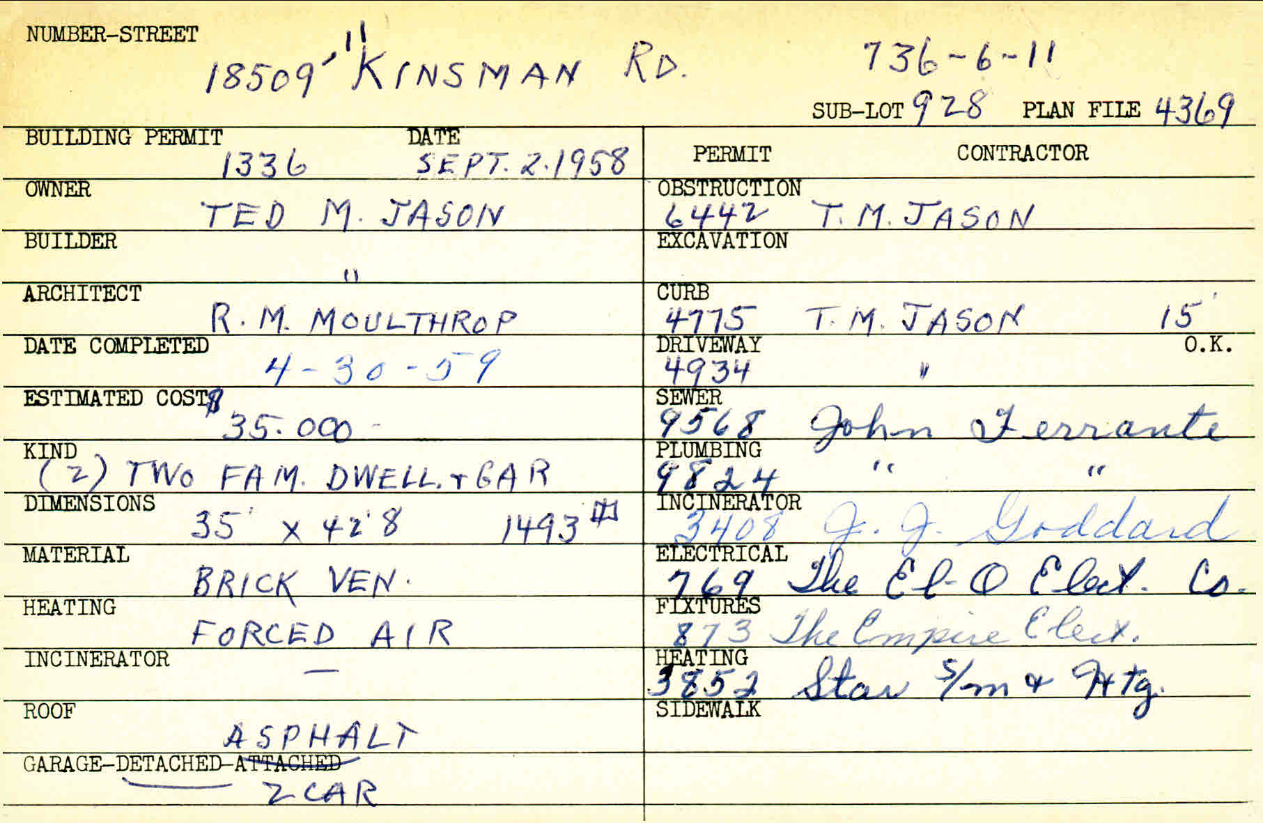 18509 Chagrin Boulevard Shaker Heights, OH 44122 PARCEL ID: 736-06-011 Building Permit Date: 09-02-1958 Plan File Number: 4369 all scanned Microfilm Roll: Roll062 Neighborhood: Lomond Owner: Jason, Ted M. Builder: Jason, Ted M. Architect: Moulthrop, R. M. Estimated Cost: 35000 Date Completed: 04-30-1959 Kind: Duplex or Two-Family and Garage Material: Brick Veneer Heating: Forced Air Roof: Asphalt Garage: detached 2 car |