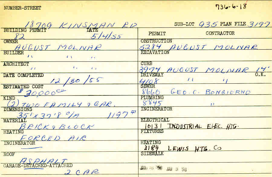 18709 Chagrin Boulevard Shaker Heights, OH 44122 PARCEL ID: 736-06-018 Building Permit Date: 05-04-1955 Plan File Number: 3197 Microfilm Roll: Roll#44 Neighborhood: Lomond Owner: Molnar, August Builder: Molnar, August Architect: Molnar, August Estimated Cost: 30000 Date Completed: 12-30-1955 Kind: Duplex or Two-Family and Garage Material: Brick and Block Heating: Forced Air Roof: Asphalt Garage: detached 2 car |