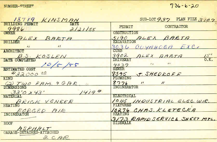 18719 Chagrin Boulevard Shaker Heights, OH 44122 PARCEL ID: 736-06-020 Building Permit Date: 02-21-1955 Plan File Number: 926 scanned, 3107 Microfilm Roll: Roll012, Roll#43 Neighborhood: Lomond Owner: Barta, Alex Builder: Barta, Alex Architect: Koslen, B.S. Estimated Cost: 32000 Date Completed: 10-05-1955 Kind: Duplex or Two-Family and Garage Material: Brick Veneer Heating: Forced Air Roof: Asphalt Garage: detached 2 car |