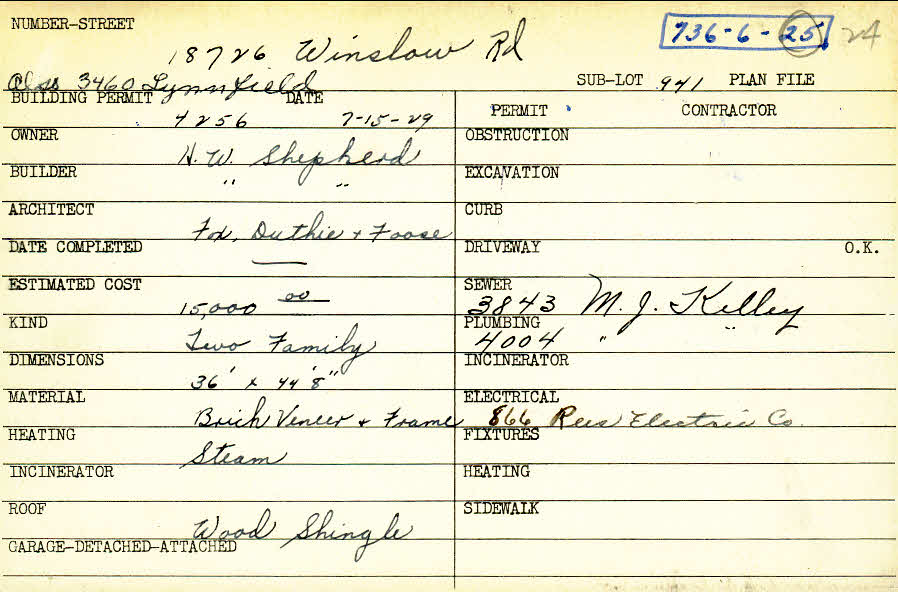 18726 Winslow Road Shaker Heights, OH 44122 PARCEL ID: 736-06-024 Building Permit Date: 07-15-1929 Plan File Number: 0 Neighborhood: Lomond Owner: Shepherd, H. W. Builder: Shepherd, H. W. Architect: Fox, Duthie and Foose Estimated Cost: 15000 Kind: Duplex or Two-Family Material: Brick Veneer and Frame Heating: Steam Roof: Wood Shingle  |