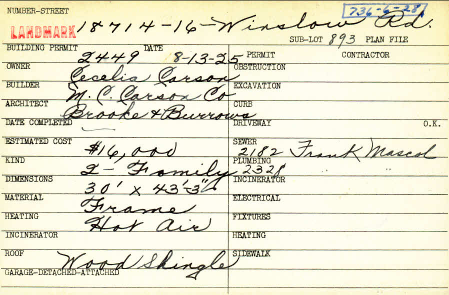 18714 Winslow Road Shaker Heights, OH 44122 PARCEL ID: 736-06-028 Building Permit Date: 08-13-1925 Plan File Number: 1256, 4864 all scanned Microfilm Roll: Roll015, Roll066 Owner: Carson, Cecelia Builder: M. C. Carson Company Architect: Brooke and Burrows Estimated Cost: 16000 Kind: Duplex or Two-Family Material: Frame Heating: Hot Air Roof: Wood Shingle Blueprints: online, see link above  |