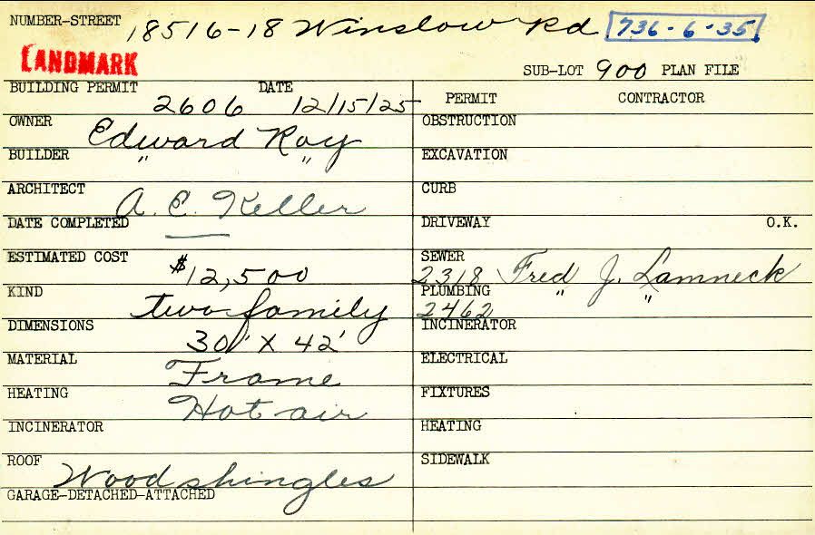18516 Winslow Road Shaker Heights, OH 44122 PARCEL ID: 736-06-035 Building Permit Date: 12-15-1925 Plan File Number: 0 Neighborhood: Lomond Owner: Roy, Edward Builder: Roy, Edward Architect: Keller, Arthur Emil Estimated Cost: 12500 Kind: Duplex or Two-Family Material: Frame Heating: Hot Air Roof: Wood Shingle |