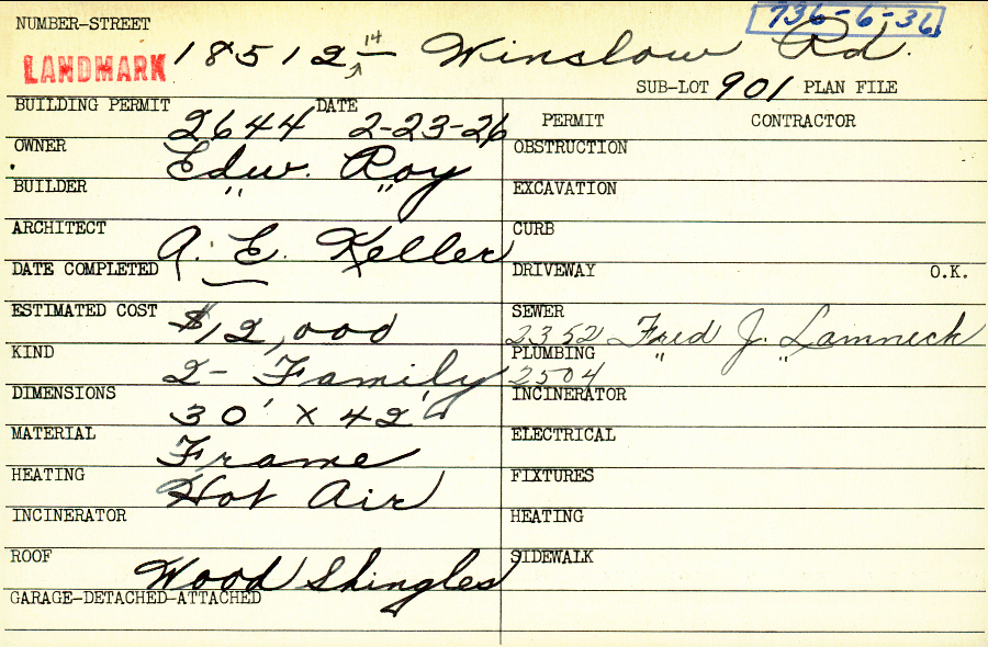 18514 Winslow Road Shaker Heights, OH 44122 PARCEL ID: 736-06-036 Building Permit Date: 02-23-1926 Plan File Number: 0 Neighborhood: Lomond Owner: Roy, Edward Builder: Roy, Edward Architect: Keller, Arthur Emil Estimated Cost: 12000 Kind: Duplex or Two-Family Material: Frame Heating: Hot Air Roof: Wood Shingle Card Available: Yes |