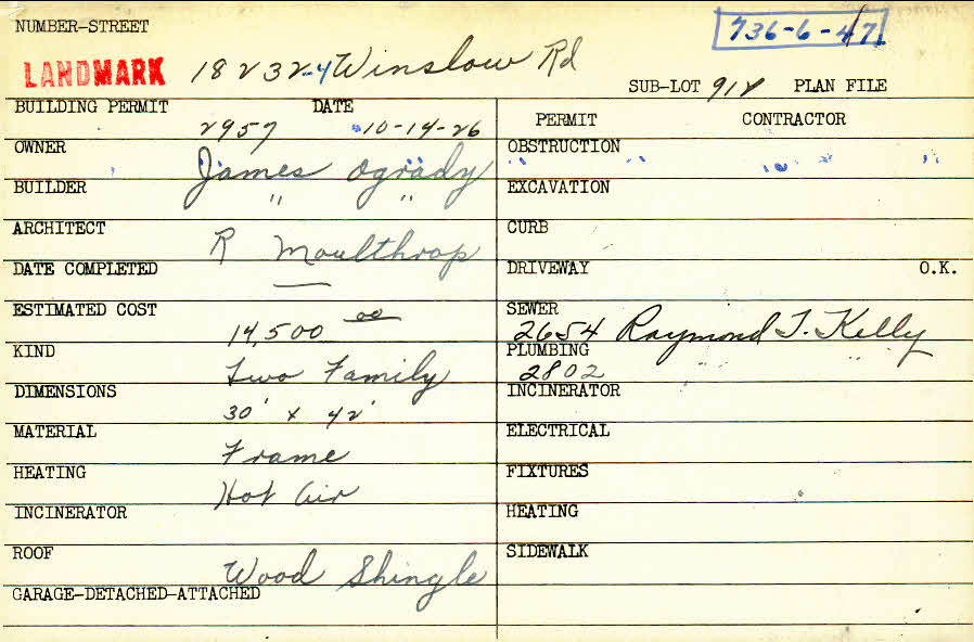 18232 Winslow Road Shaker Heights, OH 44122 PARCEL ID: 736-06-047 Building Permit Date: 10-14-1926 Plan File Number: 0 Neighborhood: Lomond Owner: Ogrady, James Builder: Ogrady, James Architect: Moulthrop, R. Estimated Cost: 14500 Kind: Duplex or Two-Family Material: Frame Heating: Hot Air Roof: Wood Shingle |