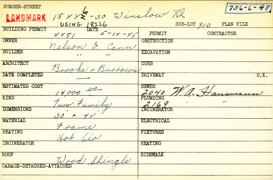 18226 Winslow Road Shaker Heights, OH 44122 PARCEL ID: 736-06-048 Building Permit Date: 05-12-1925 Plan File Number: 2518 all scanned Microfilm Roll: Roll036 Owner: Cann, Nelson D. Builder: Cann, Nelson D. Architect: Brooke and Burrows Estimated Cost: 14000 Kind: Duplex or Two-Family Material: Frame Heating: Hot Air Roof: Wood Shingle Blueprints: online, see link above |