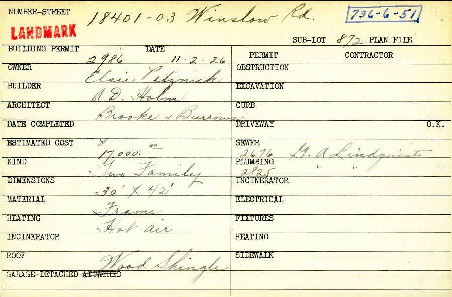 18401 Winslow Road Shaker Heights, OH 44122 PARCEL ID: 736-06-051 Building Permit Date: 11-02-1926 Plan File Number: 10799 Microfilm Roll: NewRoll#5 Neighborhood: Lomond Owner: Petznick, Elsie Builder: Holm, A. D. Architect: Brooke and Burrows Estimated Cost: 17000 Kind: Duplex or Two-Family Material: Frame Heating: Hot Air Roof: Wood Shingle Garage: detached |
