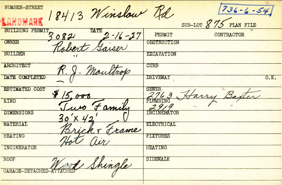 18413 Winslow Road Shaker Heights, OH 44122 PARCEL ID: 736-06-054 Building Permit Date: 02-16-1927 Plan File Number: 0 Neighborhood: Lomond Owner: Gaiser, Robert Builder: Gaiser, Robert Architect: Moultrop, R. J. Estimated Cost: 15000 Kind: Duplex or Two-Family Material: Brick and Frame Heating: Hot Air Roof: Wood Shingle |