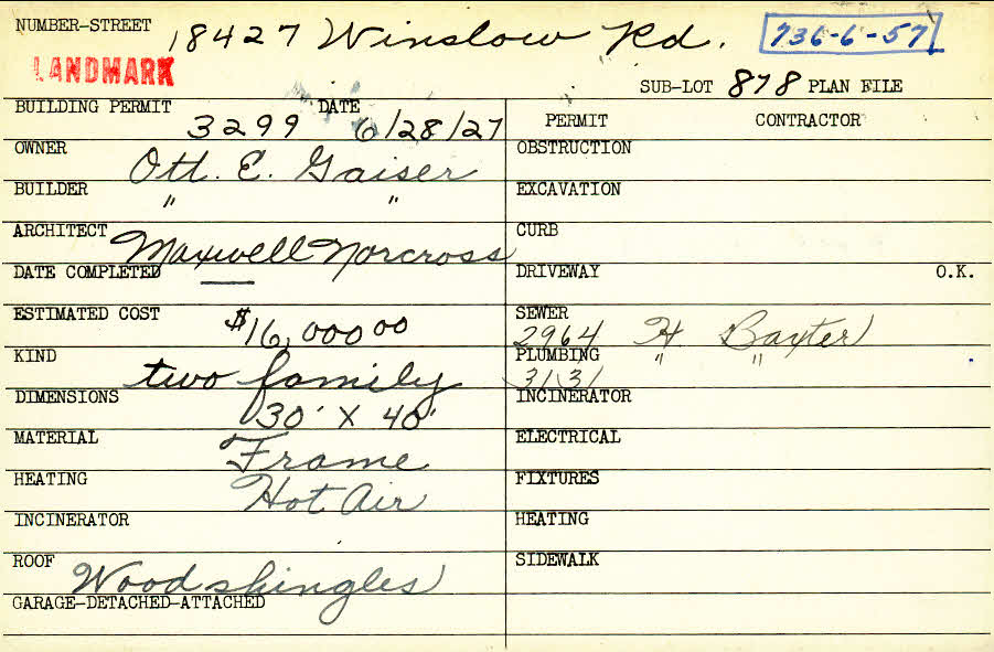 18427 Winslow Road Shaker Heights, OH 44122 PARCEL ID: 736-06-057 Building Permit Date: 06-28-1927 Plan File Number: 10089 Microfilm Roll: Roll#106 Neighborhood: Lomond Owner: Gaiser, Ott E. Builder: Gaiser, Ott E. Architect: Norcross, Maxwell Estimated Cost: 16000 Kind: Duplex or Two-Family Material: Frame Heating: Hot Air Roof: Wood Shingle |