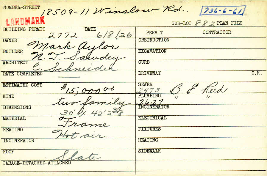 18509 Winslow Road Shaker Heights, OH 44122 PARCEL ID: 736-06-061 Building Permit Date: 06-08-1926 Plan File Number: 0 Neighborhood: Lomond Owner: Aylor, Mark Builder: Sawdey, N. T. Architect: Schneider, C. Estimated Cost: 15000 Kind: Duplex or Two-Family Material: Frame Heating: Hot Air Roof: Slate |