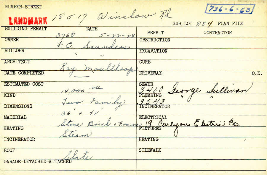 18517 Winslow Road Shaker Heights, OH 44122 PARCEL ID: 736-06-063 Building Permit Date: 05-22-1928 Plan File Number: 0 Neighborhood: Lomond Owner: Saunders, F. C. Builder: Saunders, F. C. Architect: Moulthrop, Ray Estimated Cost: 14000 Kind: Duplex or Two-Family Material: Stone Brick and Frame Heating: Steam Roof: Slate  |