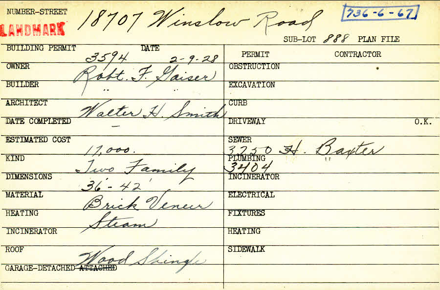 18707 Winslow Road Shaker Heights, OH 44122 PARCEL ID: 736-06-067 Building Permit Date: 02-09-1928 Plan File Number: 0 Neighborhood: Lomond Owner: Gaiser, Robert F. Builder: Gaiser, Robert F. Architect: Smith, Walter H. Estimated Cost: 17000 Kind: Duplex or Two-Family Material: Brick Veneer Heating: Steam Roof: Wood Shingle Garage: detached  |