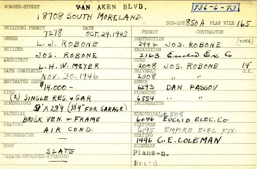 18708 Van Aken Boulevard Shaker Heights, OH 44120 PARCEL ID: 736-06-073 Building Permit Date: 10-29-1945 Plan File Number: 165 all scanned Microfilm Roll: Roll002 Neighborhood: Lomond Owner: Robone, L. J. Builder: Robone, Joseph Architect: Meyer, L. H. W. Estimated Cost: 14000 Date Completed: 11-30-1946 Kind: Single Dwelling and Garage (2) Material: Brick Veneer and Frame Heating: Air Conditioned Roof: Slate Garage: attached |