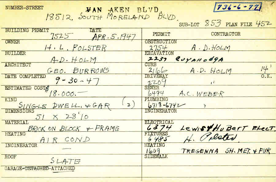 18512 Van Aken Boulevard Shaker Heights, OH 44120 PARCEL ID: 736-06-077 Building Permit Date: 04-05-1947 Plan File Number: 452 all scanned Microfilm Roll: Roll004 Neighborhood: Lomond Owner: Polster, H. L. Builder: Holm, A. D. Architect: Burrows, George Estimated Cost: 18000 Date Completed: 09-30-1947 Kind: Single Dwelling and Garage (2) Material: Brick on Block and Frame Heating: Air Conditioned Roof: Slate Garage: attached |