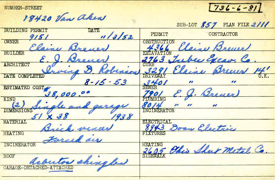 18420 Van Aken Boulevard Shaker Heights, OH 44120 PARCEL ID: 736-06-081 Plan File Number: 2111, 4855 Microfilm Roll: Roll#32, Roll#66 Neighborhood: Lomond Owner: Breuer, Elaine Builder: Breuer, E. J. Architect: Robinson, Irving D. Estimated Cost: 38000 Kind: Single, Single Residence or Dwelling (2) Material: Brick Veneer Heating: Forced Air Roof: Asbestos Garage: attached |