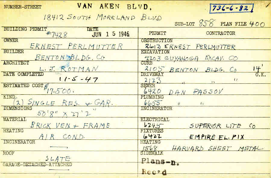 18412 Van Aken Boulevard Shaker Heights, OH 44120 PARCEL ID: 736-06-082 Building Permit Date: 06-15-1946 Plan File Number: 400 scanned, 3817 Microfilm Roll: Roll004, Roll#56 Neighborhood: Lomond Owner: Perlmutter, Ernest Builder: Benton Building Company Architect: Rotman, L. J. Estimated Cost: 17500 Date Completed: 11-05-1947 Kind: Single Dwelling and Garage (2) Material: Brick Veneer and Frame Heating: Air Conditioned Roof: Slate Garage: attached |
