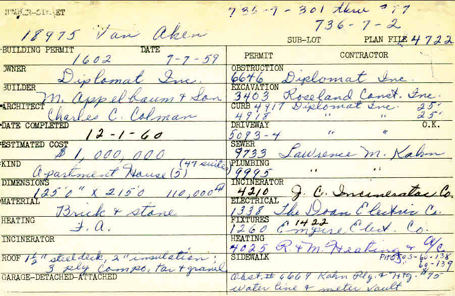 18975 Van Aken Boulevard Shaker Heights, OH 44120 PARCEL ID: 736-07-002 Building Permit Date: 07-06-1959 Plan File Number: 4722, 9988 all scanned Microfilm Roll: Roll065, Roll105 Neighborhood: Lomond Owner: Diplomat, Inc. Builder: M. Appelbaum and Son Architect: Colman, Charles C. Estimated Cost: 1000000 Date Completed: 11-30-1960 Kind: Apartment or Multi-family (3+) Material: Brick and Stone Heating: Forced Air Blueprints: online, see link above |