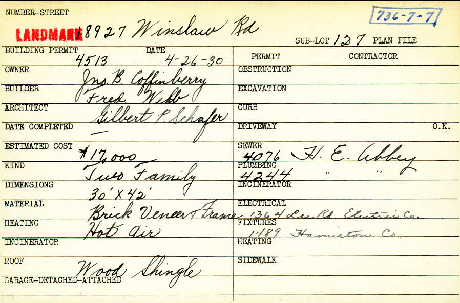 18927 Winslow Road Shaker Heights, OH 44122 PARCEL ID: 736-07-007 Building Permit Date: 04-26-1930 Plan File Number: 0 Neighborhood: Sussex Owner: Coffinberry, John B. Builder: Webb, Fred. Architect: Schafer, Gilbert P. Estimated Cost: 17000 Kind: Duplex or Two-Family Material: Brick Veneer and Frame Heating: Hot Air Roof: Wood Shingle  |