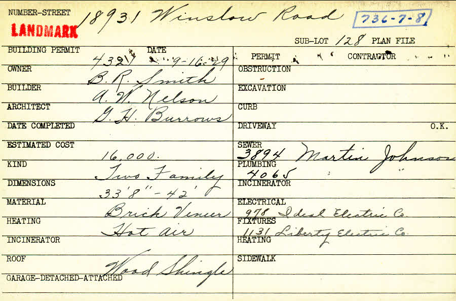 18931 Winslow Road Shaker Heights, OH 44122 PARCEL ID: 736-07-008 Building Permit Date: 09-16-1929 Plan File Number: 6186 Microfilm Roll: Roll#83 Neighborhood: Sussex Owner: Smith, B. R. Builder: Nelson, A. W. Architect: Burrows, G. H. Estimated Cost: 16000 Kind: Duplex or Two-Family Material: Brick Veneer Heating: Hot Air Roof: Wood Shingle  |