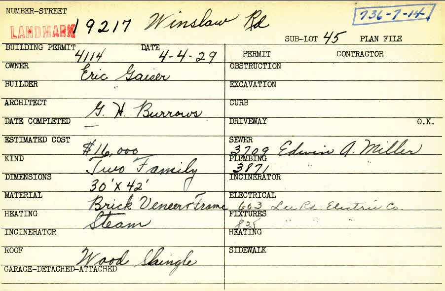 19217 Winslow Road Shaker Heights, OH 44122 PARCEL ID: 736-07-014 Building Permit Date: 04-04-1929 Plan File Number: 0 Neighborhood: Sussex Owner: Gaiser, Eric Builder: Gaiser, Eric Architect: Burrows, G. H. Estimated Cost: 16000 Kind: Duplex or Two-Family Material: Brick Veneer and Frame Heating: Steam Roof: Wood Shingle  |