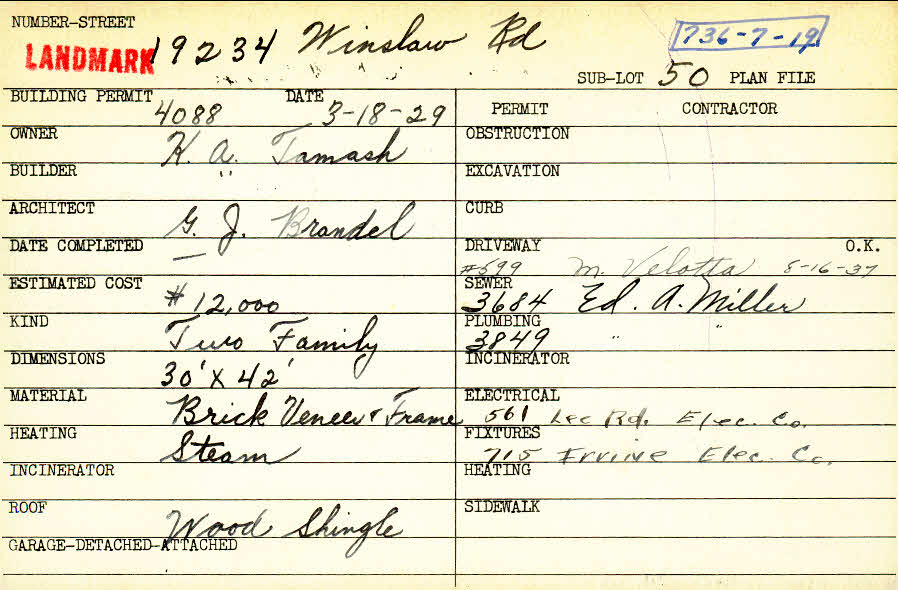 19234 Winslow Road Shaker Heights, OH 44122 PARCEL ID: 736-07-019 Building Permit Date: 03-18-1929 Plan File Number: 1523 Microfilm Roll: Roll#24 Neighborhood: Sussex Owner: Tamash, K. A. Builder: Tamash, K. A. Architect: Brandel, G. J. Estimated Cost: 12000 Kind: Duplex or Two-Family Material: Brick Veneer and Frame Heating: Steam Roof: Wood Shingle  |