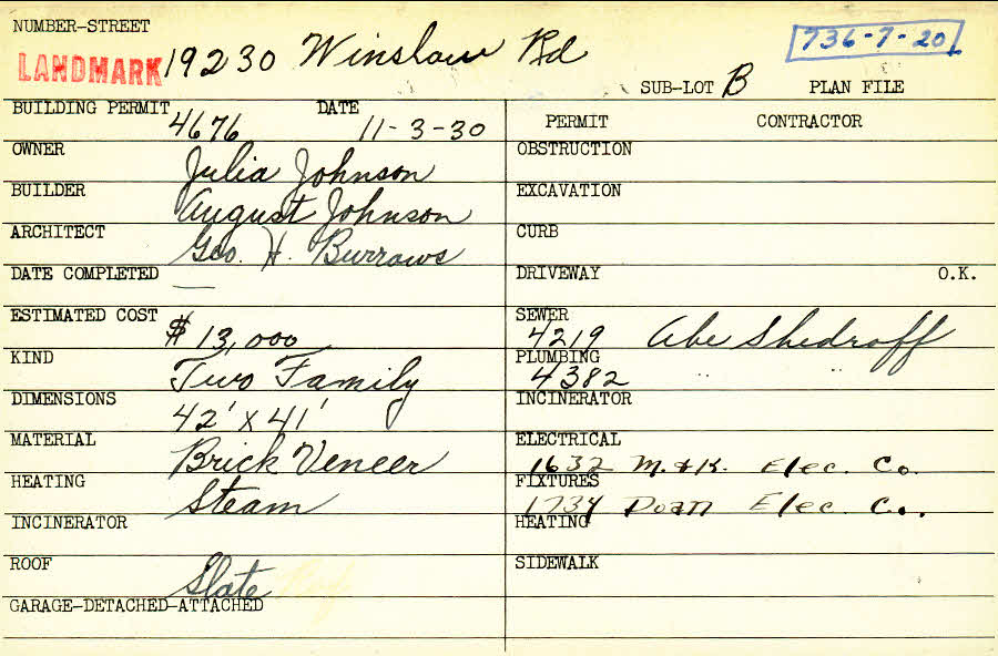 19230 Winslow Road Shaker Heights, OH 44122 PARCEL ID: 736-07-020 Building Permit Date: 11-03-1930 Plan File Number: 0 Neighborhood: Sussex Owner: Johnson, Julia Builder: Johnson, August Architect: Burrows, George H. Estimated Cost: 13000 Kind: Duplex or Two-Family Material: Brick Veneer Heating: Steam Roof: Slate  |