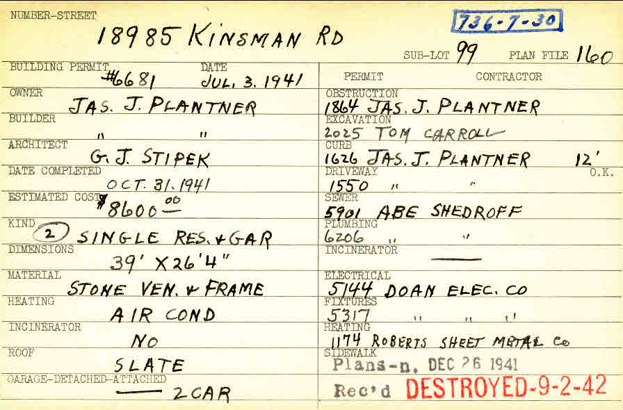 18985 Chagrin Boulevard Shaker Heights, OH 44122 PARCEL ID: 736-07-030 Building Permit Date: 07-03-1941 Plan File Number: 160 Neighborhood: Sussex Owner: Plantner, James J. Builder: Plantner, James J. Architect: Stipek, G. J. Estimated Cost: 8600 Date Completed: 10-31-1941 Kind: Single Dwelling and Garage (2) Material: Stone Veneer and Frame Heating: Air Conditioned Roof: Slate Garage: attached 2 car Card Available: yes |