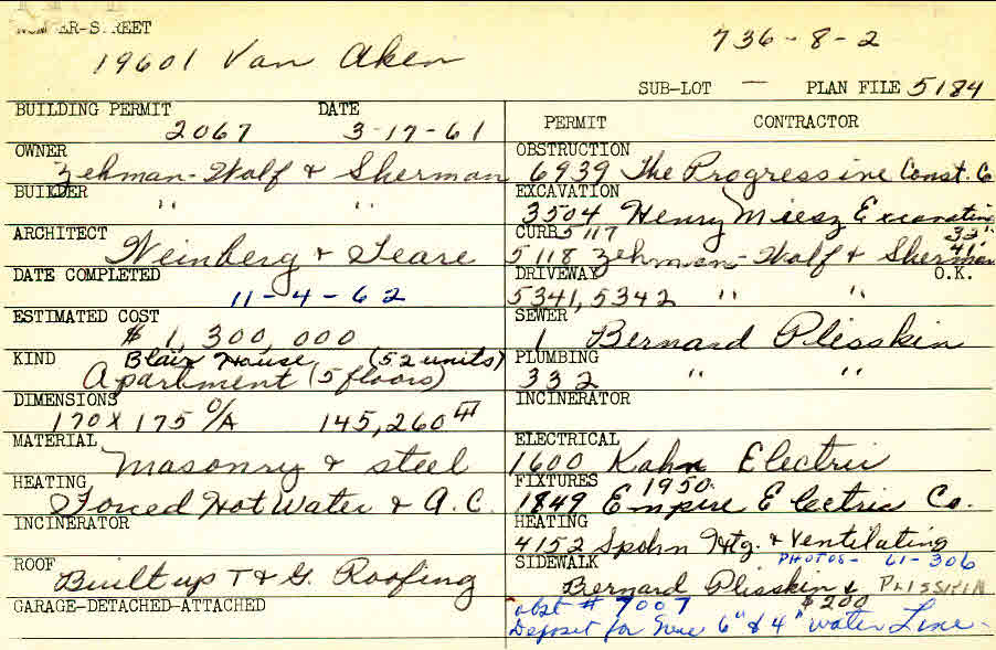 19601 Van Aken Boulevard Shaker Heights, OH 44120 PARCEL ID: 736-08-002 Building Permit Date: 03-17-1961 Plan File Number: 5184, 6036 Microfilm Roll: Roll#70, Roll#72, Roll#80 Neighborhood: Lomond Owner: Zehman, Wolf and Sherman Builder: Zehman, Wolf and Sherman Architect: Weinberg and Teare Estimated Cost: 1300000 Date Completed: 11-04-1962 Kind: Apartment or Multi-family (3+) Material: Masonry and Steel Heating: Air Conditioned |