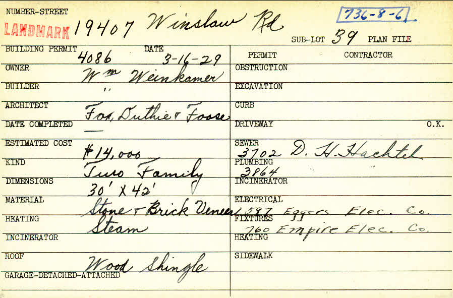 19407 Winslow Road Shaker Heights, OH 44122 PARCEL ID: 736-08-006 Building Permit Date: 03-16-1929 Plan File Number: 413 scanned, 6037 Microfilm Roll: Roll004, Roll#80 Owner: Weinkamer, William Builder: Weinkamer, William Architect: Fox, Duthie and Foose Estimated Cost: 14000 Kind: Duplex or Two-Family Material: Stone and Brick Veneer Heating: Steam Roof: Wood Shingle  |