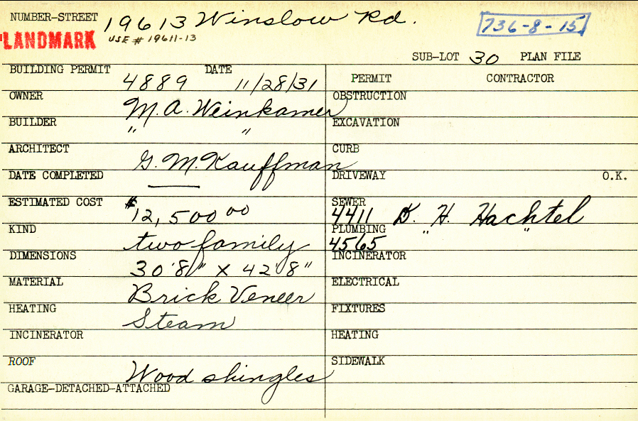 19611 Winslow Road Shaker Heights, OH 44122 PARCEL ID: 736-08-015 Building Permit Date: 11-28-1931 Plan File Number: 0 Neighborhood: Sussex Owner: Weinkamer, M. A. Builder: Weinkamer, M. A. Architect: Kauffman, G. M. Estimated Cost: 12500 Kind: Duplex or Two-Family Material: Brick Veneer Heating: Steam Roof: Wood Shingle Card Available: Yes  |