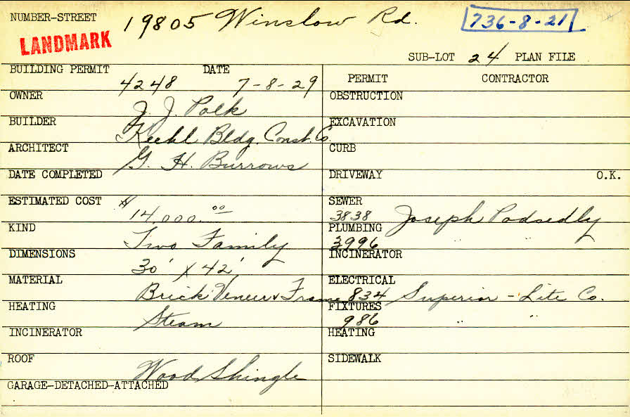19805 Winslow Road Shaker Heights, OH 44122 PARCEL ID: 736-08-021 Building Permit Date: 07-08-1929 Plan File Number: 1818 scanned, 6085 Microfilm Roll: Roll027, Roll#81 Neighborhood: Sussex Owner: Polk, J. J. Builder: Keehl Building Construction Company Architect: Burrows, G. H. Estimated Cost: 14000 Kind: Duplex or Two-Family Material: Brick Veneer and Frame Heating: Steam Roof: Wood Shingle |