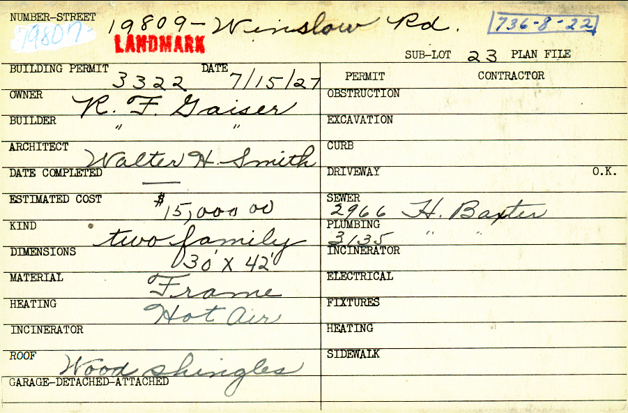 19807 Winslow Road Shaker Heights, OH 44122 PARCEL ID: 736-08-022 Building Permit Date: 07-15-1927 Plan File Number: 0 Neighborhood: Sussex Owner: Gaiser, R. F. Builder: Gaiser, R. F. Architect: Smith, Walter H. Estimated Cost: 15000 Kind: Duplex or Two-Family Material: Frame Heating: Hot Air Roof: Wood Shingle Card Available: Yes |