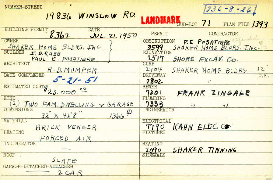 19836 Winslow Road Shaker Heights, OH 44122 PARCEL ID: 736-08-026 Building Permit Date: 07-21-1950 Plan File Number: 1393 all scanned Microfilm Roll: Roll016 Owner: Shaker Home Builders Inc Builder: Rabb, I. B. and Posatiere, Paul E. Architect: Mumper, R. D. Estimated Cost: 23000 Date Completed: 05-21-1951 Kind: Duplex or Two-Family and Garage Material: Brick Veneer Heating: Forced Air Roof: Slate Garage: detached 2 car |